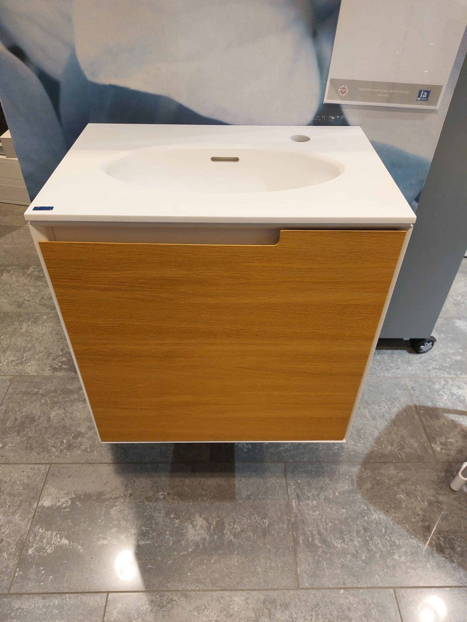Standfest Corian Handwaschbecken B 50 cm x T 34 cm Inkl. Waschtischunterschrank mit 1 Tür, Anschlag rechts Griffmulde, Eiche Echtholz lackiert